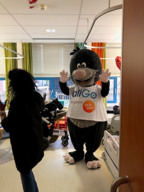 Veel kinderen in het ziekenhuis werden bezocht. Op de afdeling stond een wensboom en er werden creatieve activiteiten georganiseerd. Onder begeleiding van vrolijke muziek gingen de mascottes de kamers langs en deelden ballonnen, knuffels en high-fives uit. Ook kregen alle kinderen een tasje. Daarin zat een kleurboek met onder andere twee kleurplaten en een marker van allGo erin. Het was erg fijn dat we de kinderen even konden afleiden en laten vergeten dat ze in het ziekenhuis waren. Naast de focus op de kinderen werd ook het zorgpersoneel van de kinderafdeling in het zonnetje gezet met een traktatie.