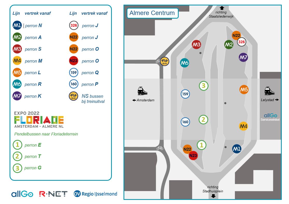 Vanaf zondag 10 april vertrekken enkele lijnbussen op station Almere Centrum vanaf een ander perron. Deze wijziging geldt voor het komende half jaar, vanwege de pendelbussen voor de Floriade.
