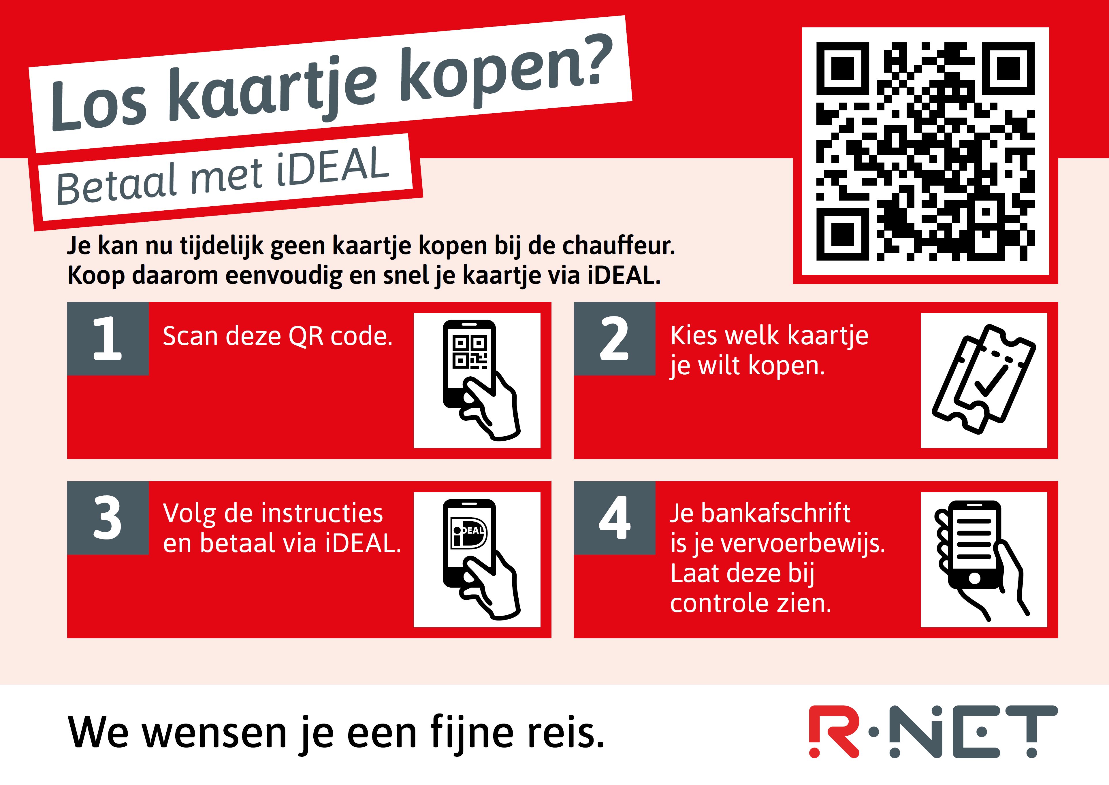 Daarnaast is mogelijk om je losse kaartje via iDEAL te betalen in de R-net bussen van en naar Almere. Dit is heel eenvoudig: scan de QR-code in de bus (of ga naar