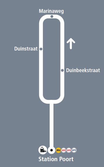 DuinGo heeft als begin- en eindpunt station Poort. Via de busbaan rijdt de bus vervolgens via de Demitrius Vikelaslaan naar Duin. Daar rijdt duinGo een rondje tegen de klok in via de Marinaweg, de Zeeduinweg, de Verlengde Duinvalleiweg en de Duinvalleiweg. Vanaf station Poort kunnen reizigers overstappen in allerlei richtingen via buslijn M4, R-net en natuurlijk de trein. Reizigers vanuit Duin zijn met duinGo in ongeveer 15 minuten in het centrum van Almere.